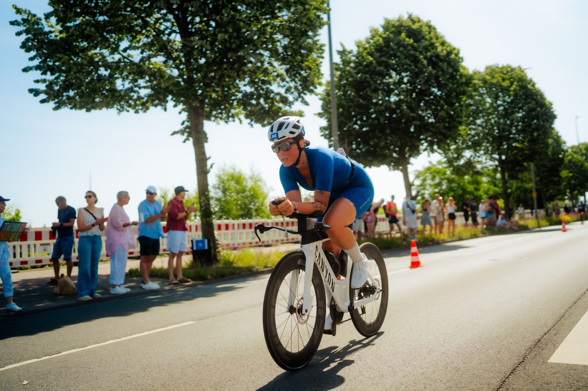 Die Olympische Distanz bietet dir die ideale Mischung aus sportlicher Herausforderung und echtem Triathlon-Feeling. Der Start im offenen Wasser wird von jubelnden Fans begleitet, die dich vom ersten Zug an pushen. Auf der Radstrecke kannst du auf den langen Geraden richtig Druck machen und dein Tempo voll ausfahren, bevor dich der Laufkurs über die Kanalpromenade zurück in den Hafen führt. Dort empfängt dich ein energiegeladenes Publikum – und das fantastische Gefühl, die Olympische Distanz mit voller Power gemeistert zu haben.